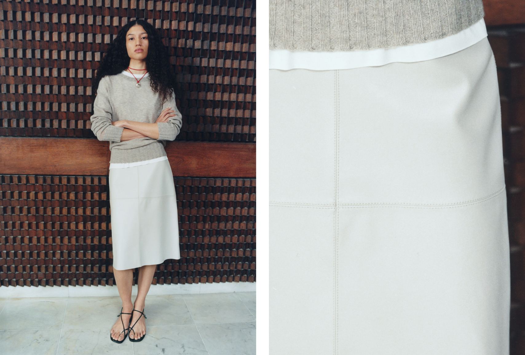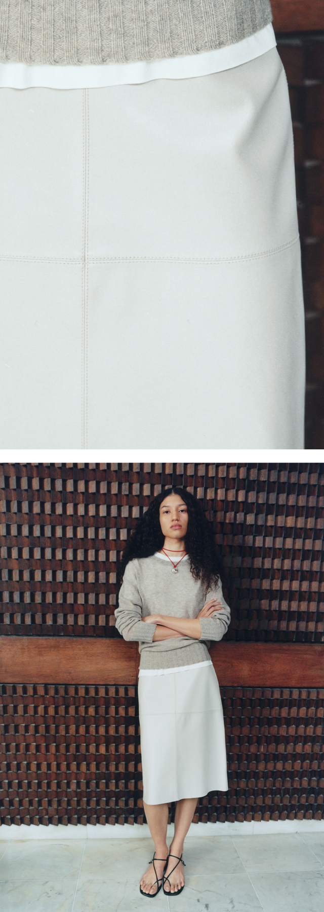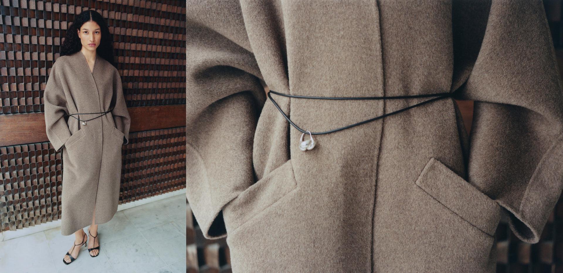 A palette of white, beige and chalk tones shapes an urban and feminine wardrobe. Materials are layered and combined with understated elegance: double-face heathered wool, supple leather, poplin and textured denim.