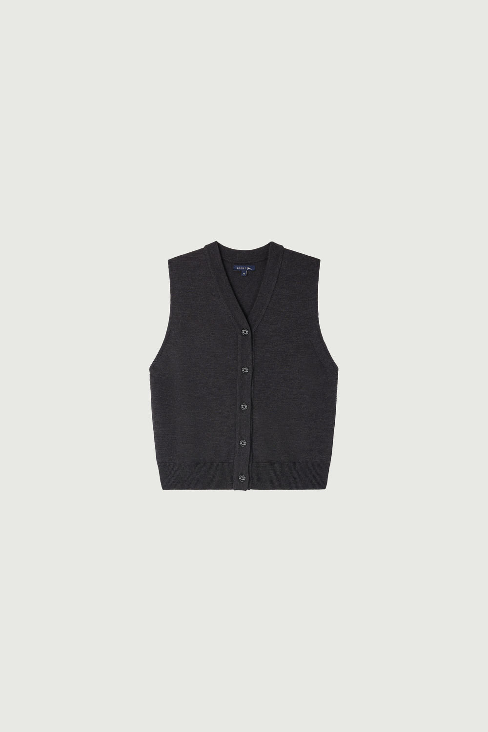 CHIARA is a small sleeveless short cardigan. Its fit is close to the body, while the V-neckline and buttoned front add a touch of sophistication. Perfect for layering and creating sleek and contemporary looks.