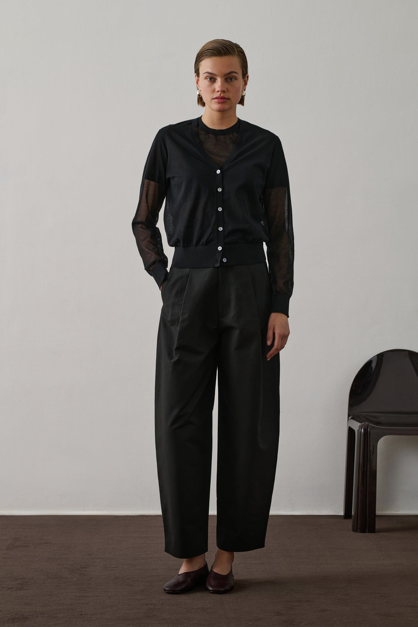 ETRETAT is a cardigan knitted in an ultra-fine knit. Transparent, it can be worn on its own or layered over a dressy or casual top, depending on the look you want to achieve.